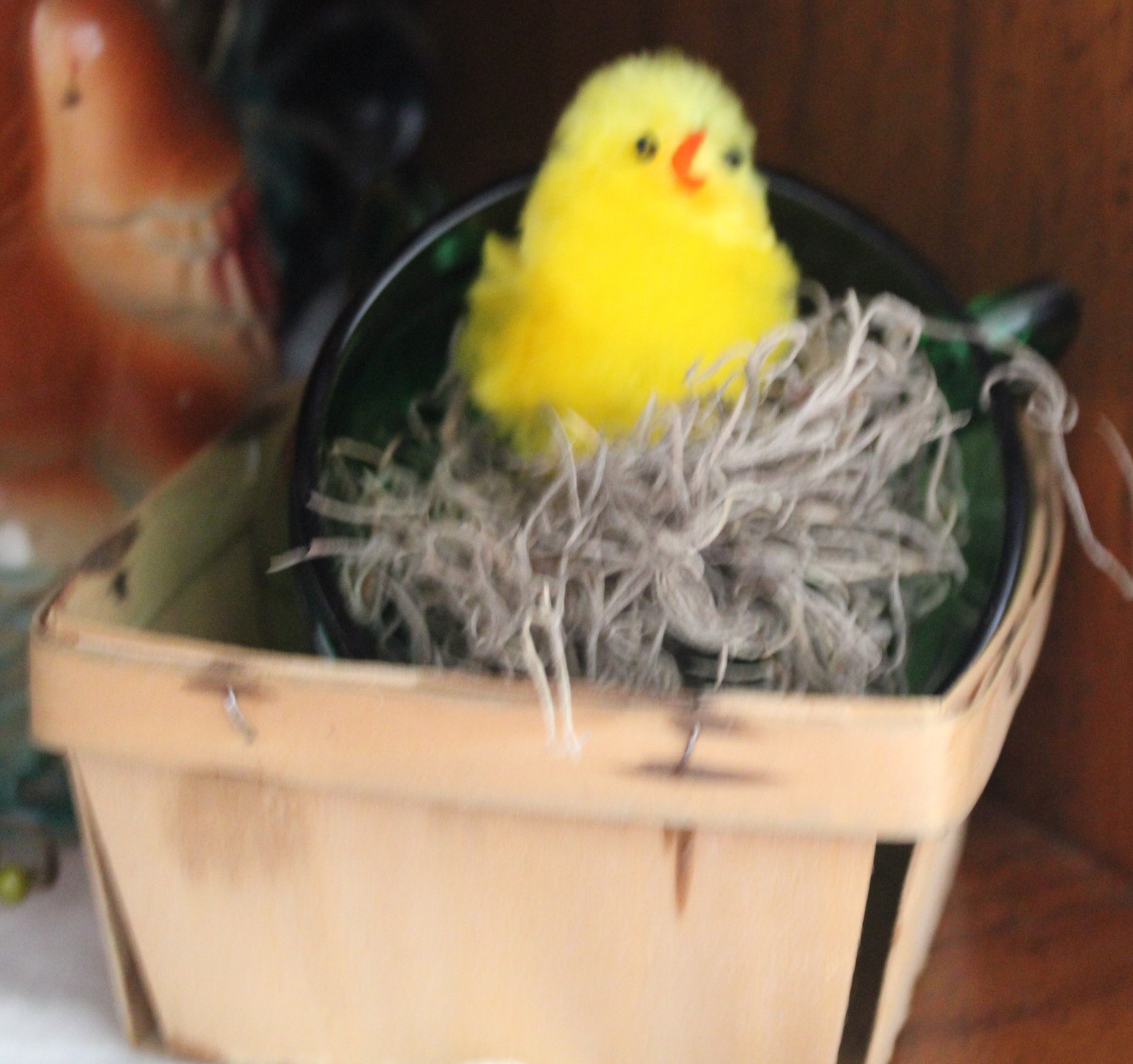 Cute thrifted Chenille yellow chick sits in a nest of shredded newspaper, (saw this idea on You-Tube.)